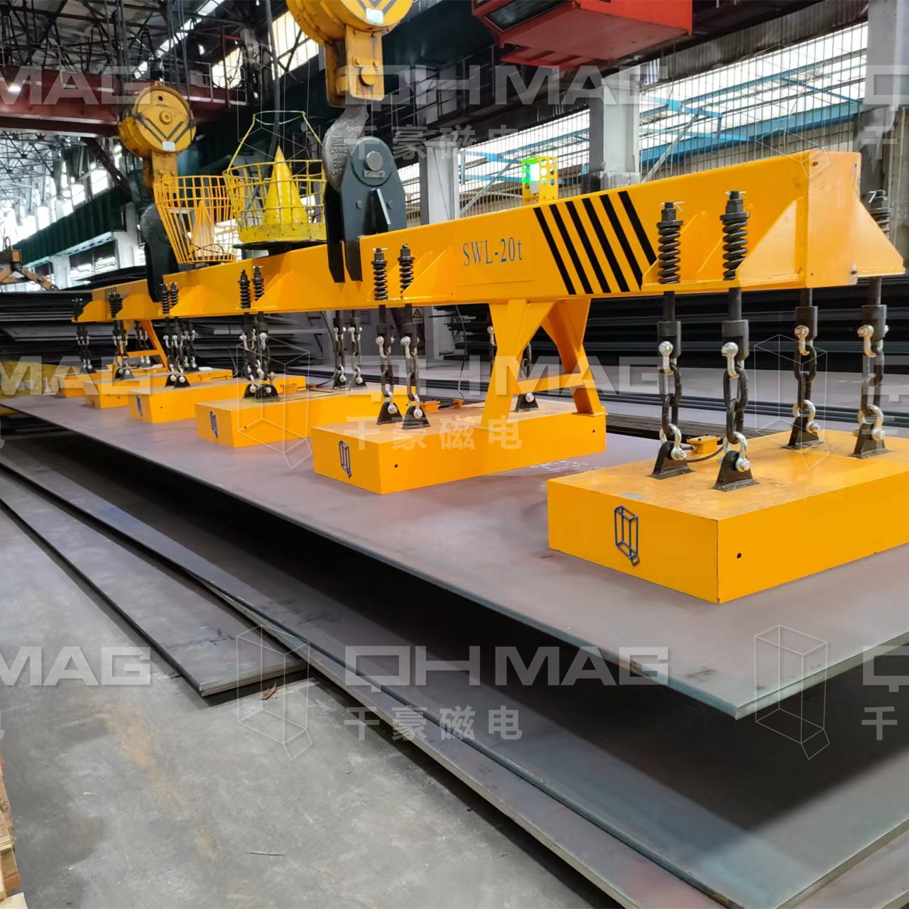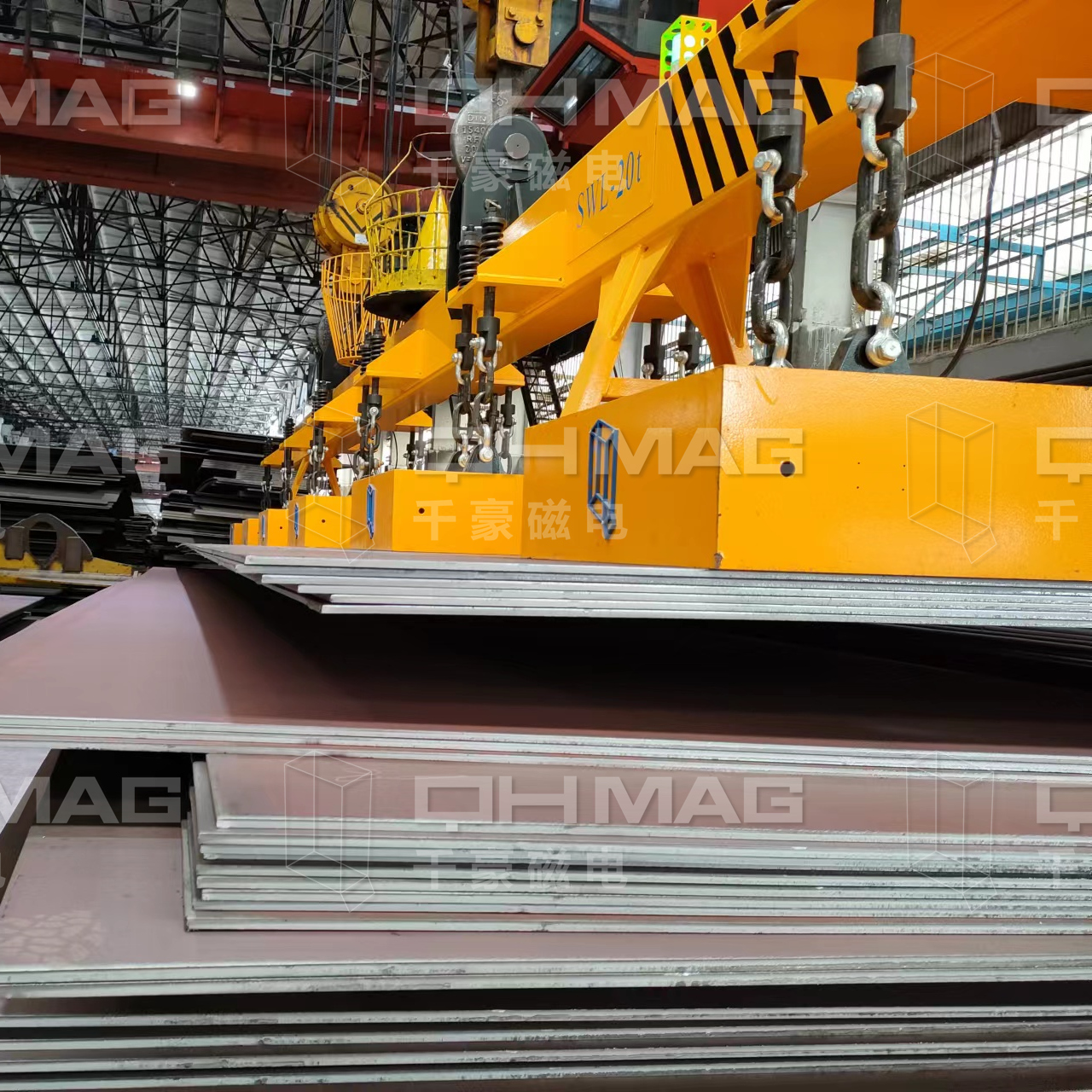 千豪磁電電永磁吊具可實(shí)現(xiàn)多張鋼板同時起吊,能適應(yīng)一定量的擾度變形,抗氣隙能力強(qiáng),多檔調(diào)磁,可實(shí)現(xiàn)多張起吊,單張放料。本次吊運(yùn)要求:鋼板溫度≤300℃,安全吸放多張鋼板能力要求根據(jù)鋼板厚度、鋼板寬度、鋼板長度來設(shè)計(jì)安全吸吊能力(張數(shù))。此款電永磁吊具可實(shí)現(xiàn)最多8張鋼板的吊運(yùn)。