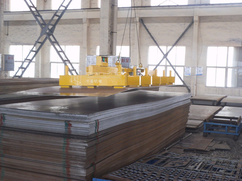 我們的薄板起重電永磁鐵對3.8mm鋼板(常規(guī)購買的4mm鋼板)的實(shí)測吸力達(dá)6.5kg/cm^2,吊運(yùn)疊層鋼板時(shí)不會黏連第二張鋼板,聯(lián)吊時(shí),合理的布局和懸掛方式可控制薄板的撓度變形。